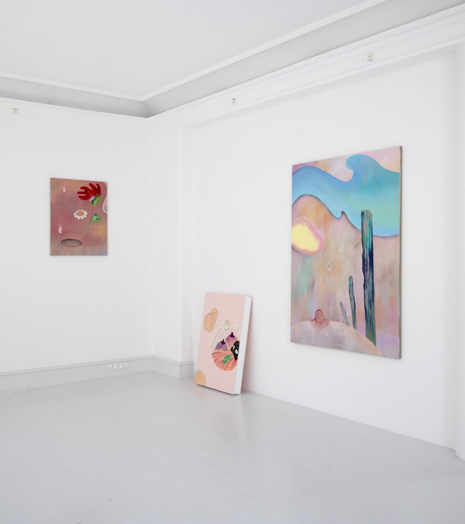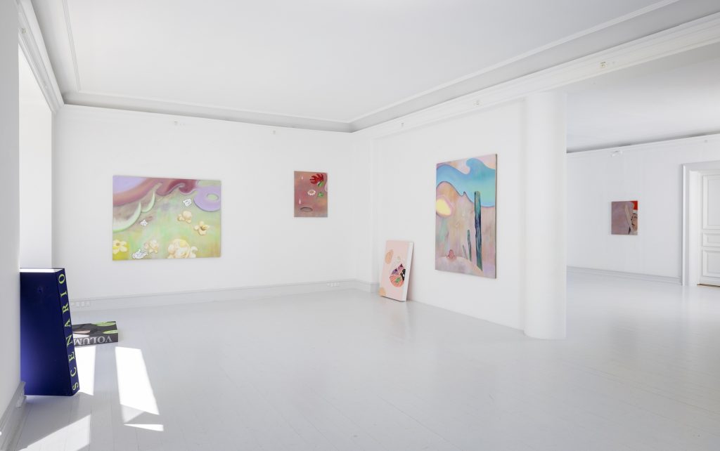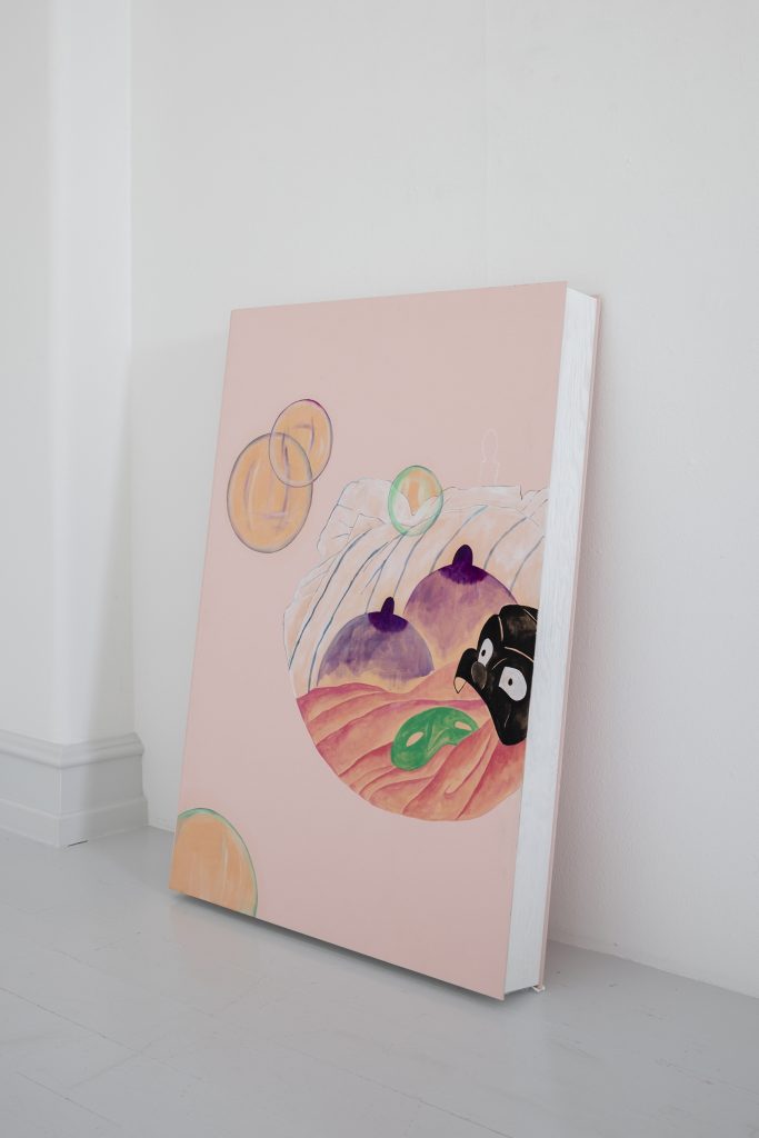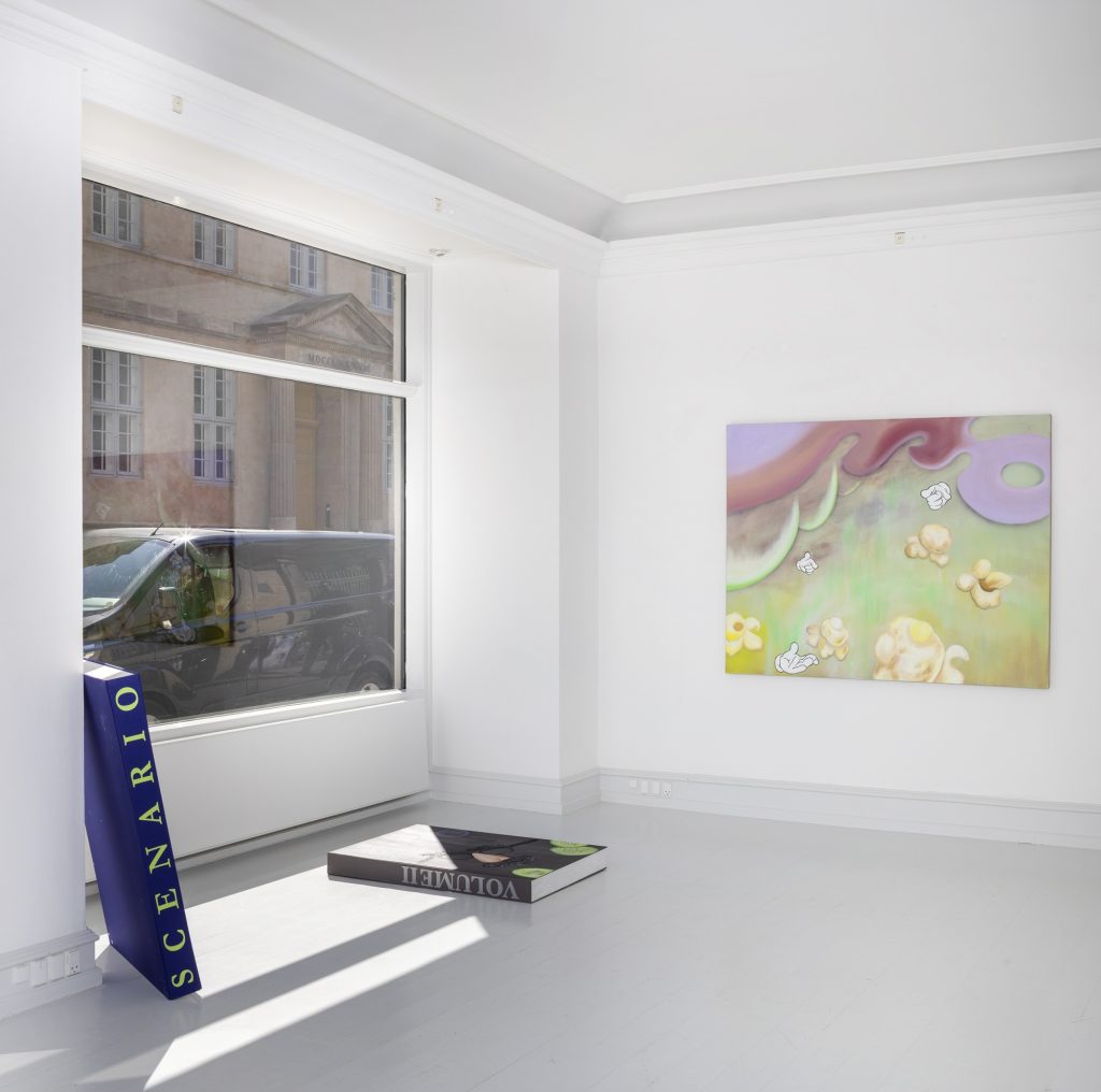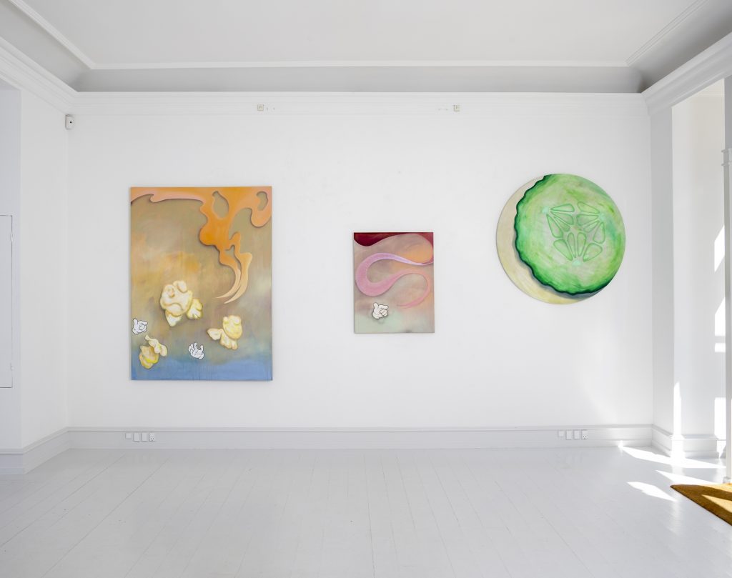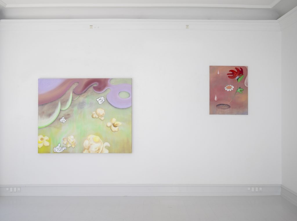 Bednarsky’s paintings often have douche and pastel-colored backgrounds. In front of these float abstract figures together with recognizable items. Here is popcorn, a breast, drips, and gloved cartoon hands. In one painting the face of a rooster merges with a flower, but in the other works the figures seem to float around on their own. Some of the depicted items have meaning within a pictural tradition. The hands might be cartoonish, but in the gestures, they preform we recognize meaning. The breast seen in one painting can symbolize femininity, motherhood or be understood as a sexual laden symbol, when seen in an art historical context. Other items in the paintings, such as popcorn, have less historical meaning within art, but might reference pop art or simply hot air.