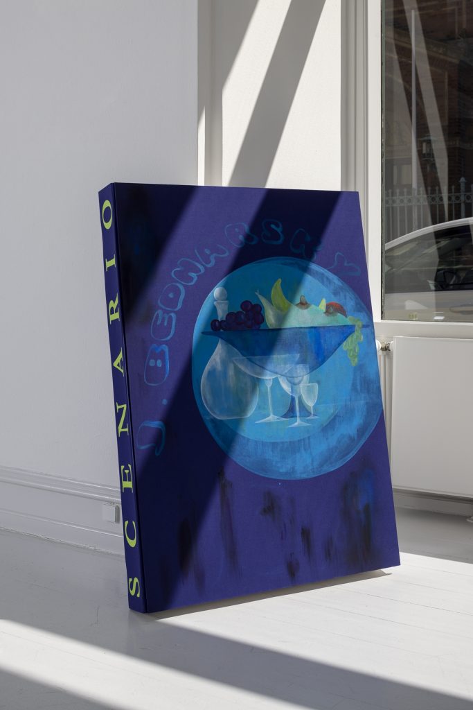 In the exhibition is also included a series of book paintings. The paintings take on the shape of large books, which though can only be read from the outside. The titles do remind you of book titles, but only vaguely. One is called Volume II but offers no explanation of what series it is part of. On some of the books the artist’s name is written and doubles as both a signature and name of a fictional writer. The artist is also present in the exhibition title, as Jagoda is Polish for blueberry. Image and name double and interchange.