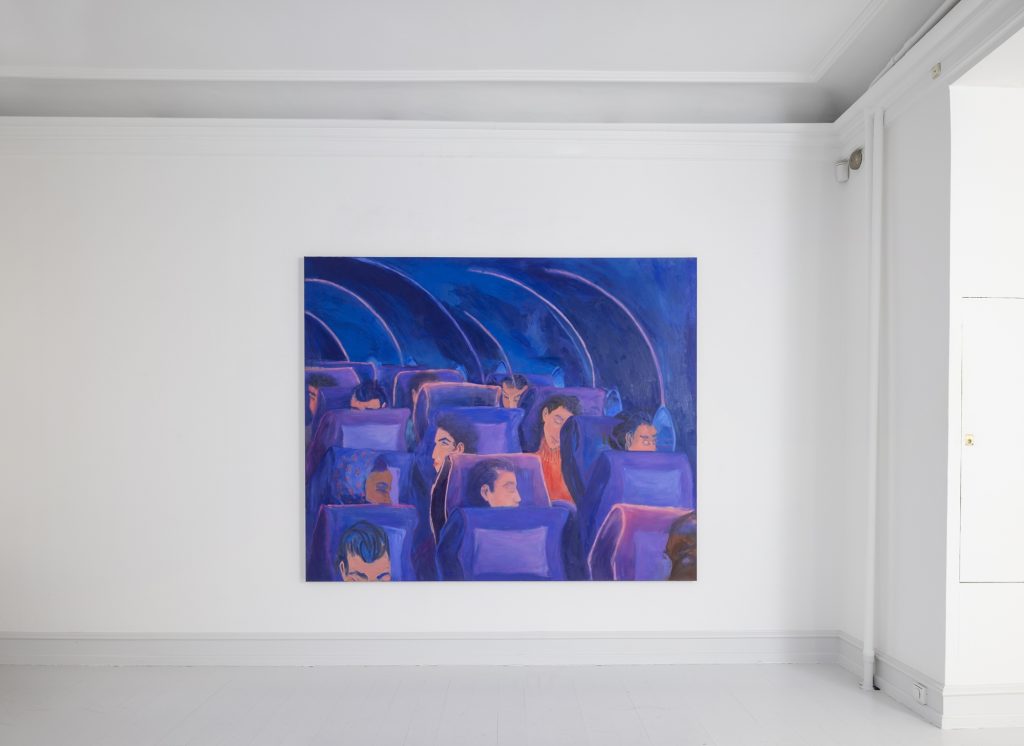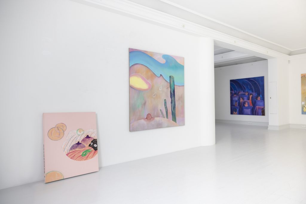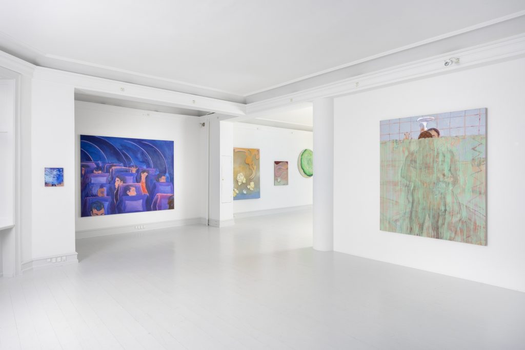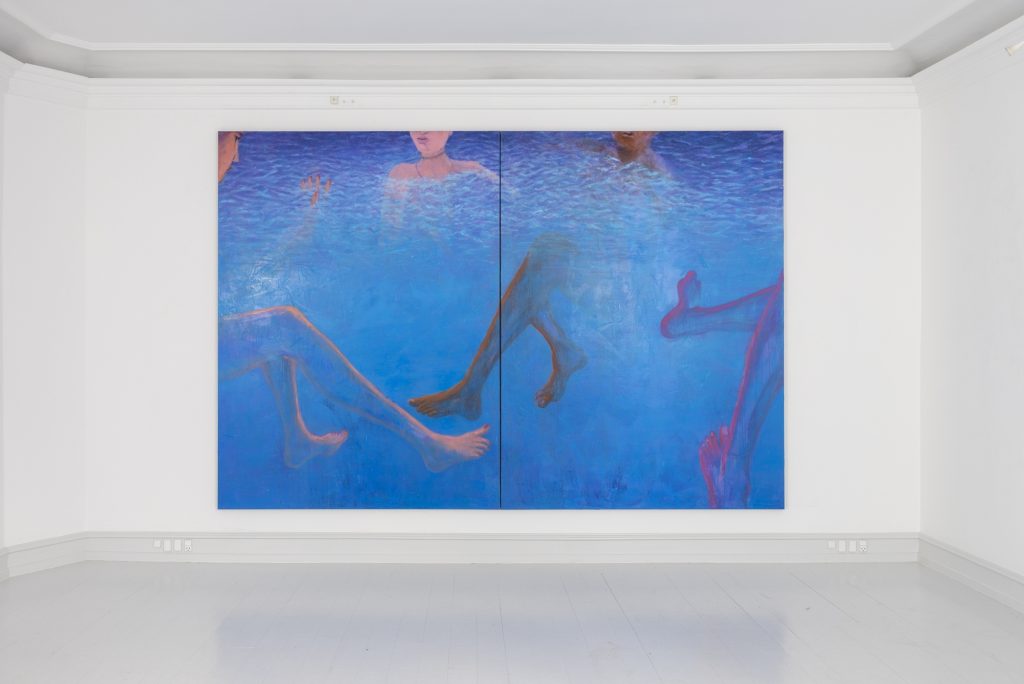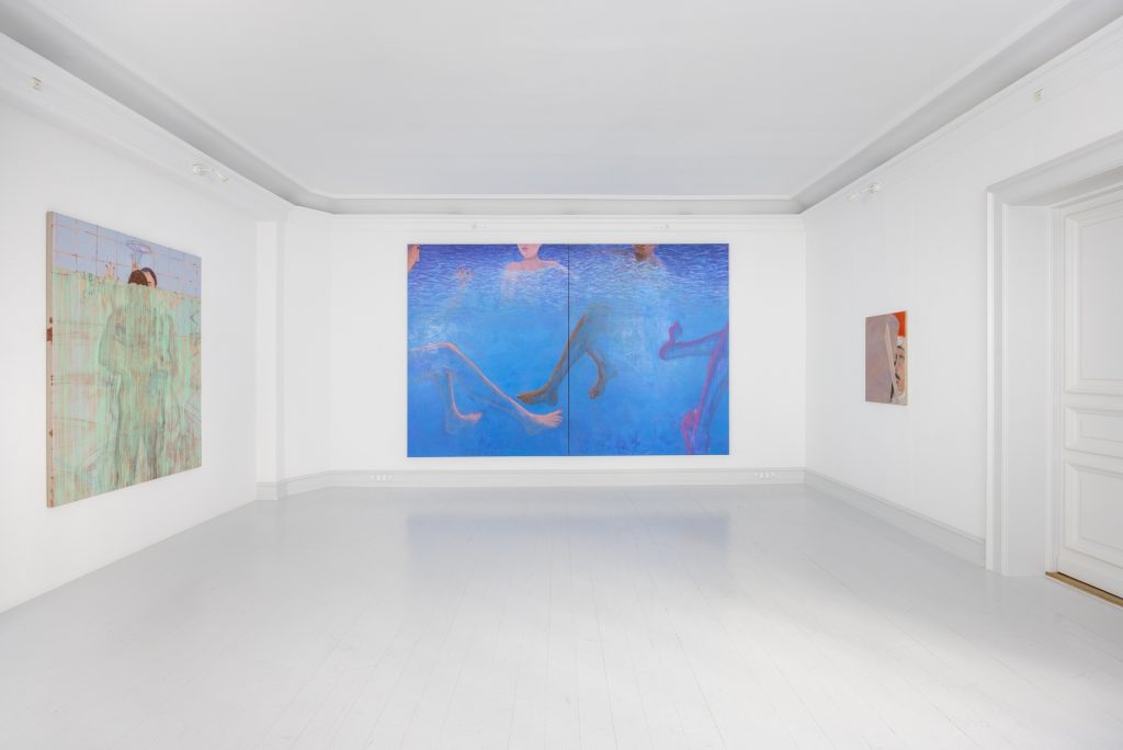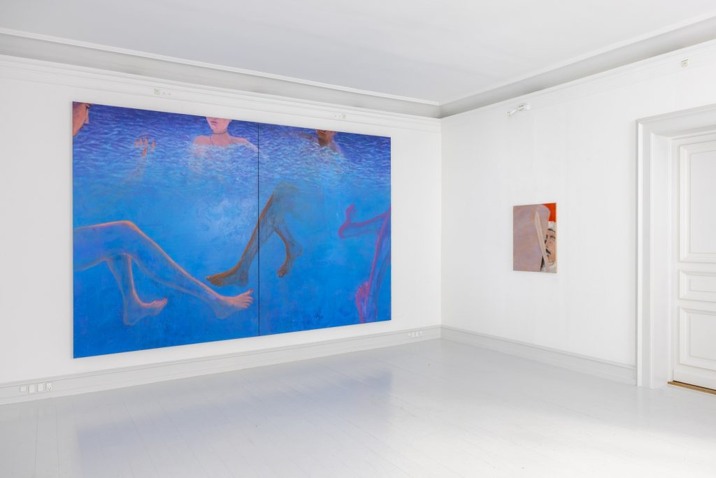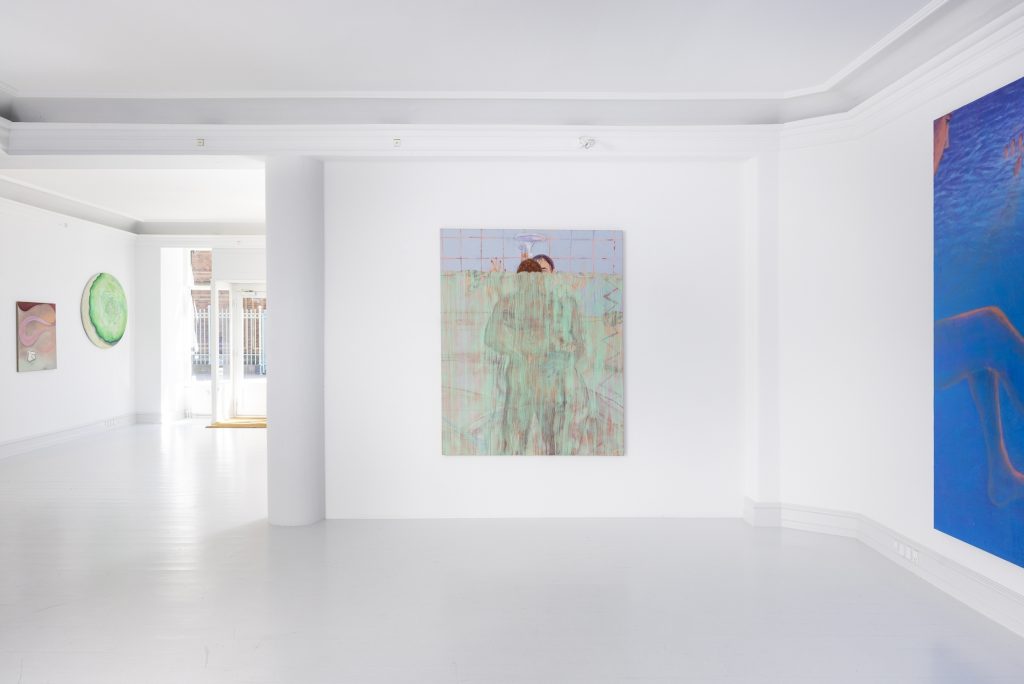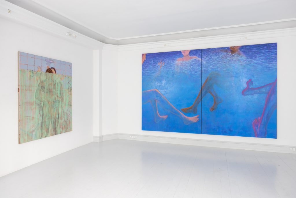 In another work Honey Lotion the viewer’s gaze is cut off by a shower curtain, which blocks almost the entire canvas. The paint that poses as a plastic shower curtain is see-through and allows us to see two figures inside the shower. As in Kosmos the sense of space in the work is built through a dynamic relationship between color, different painterly technics, and the figures. The works have their own kind of pictorial depth, but also come towards the viewer.