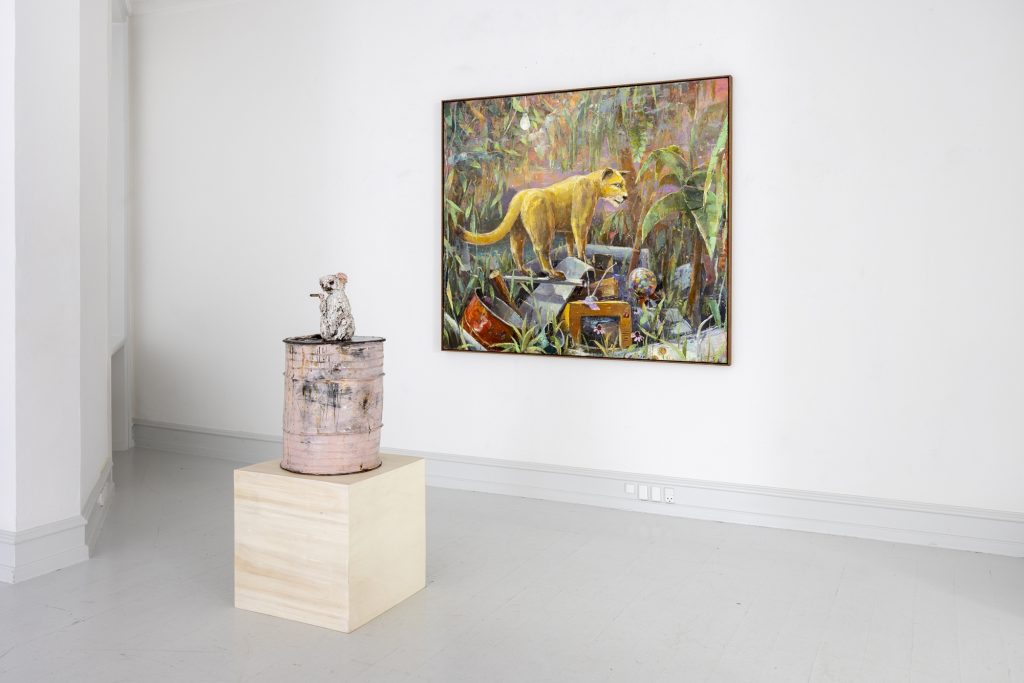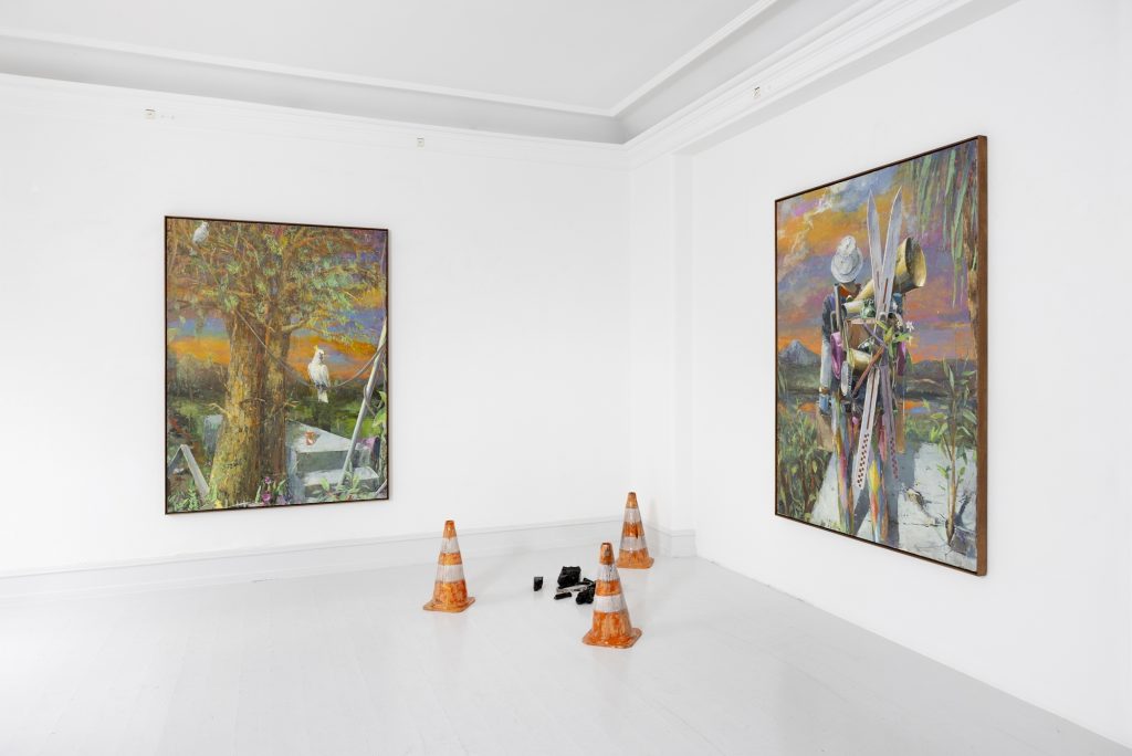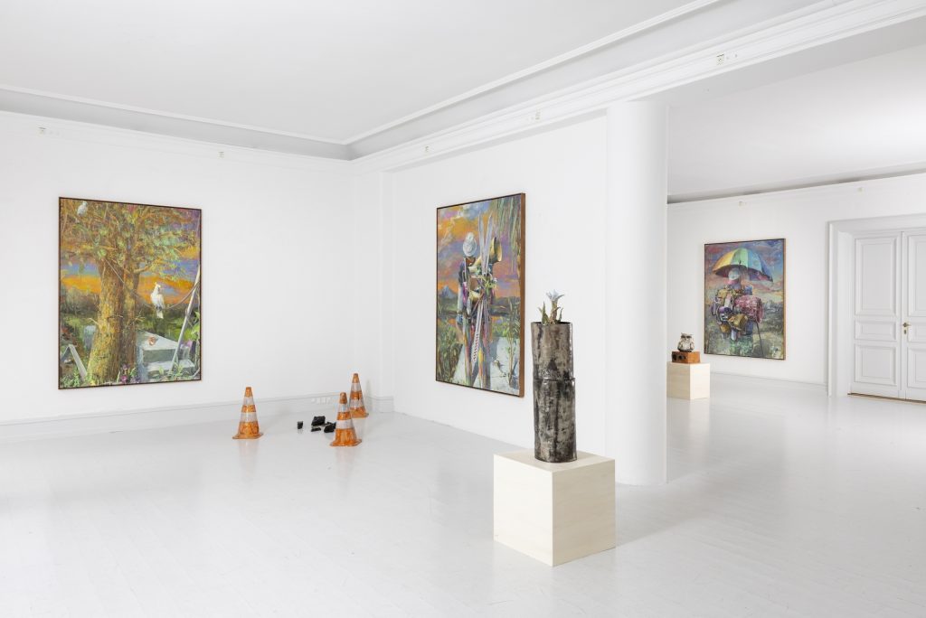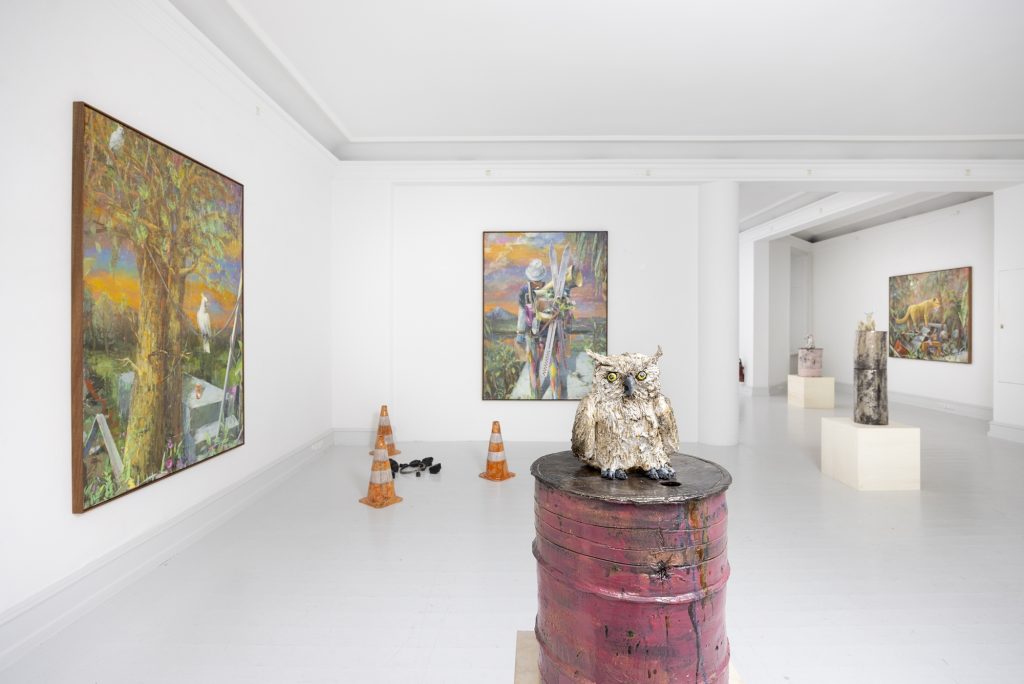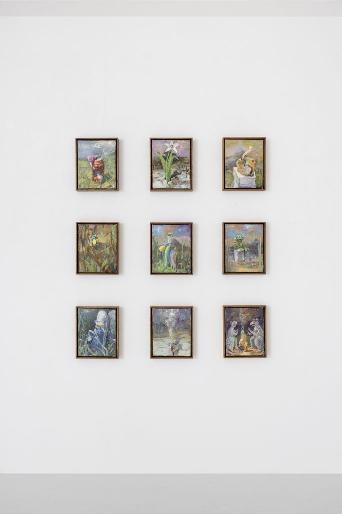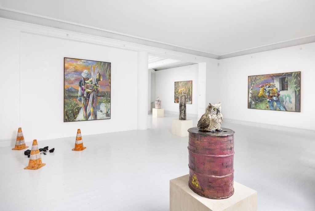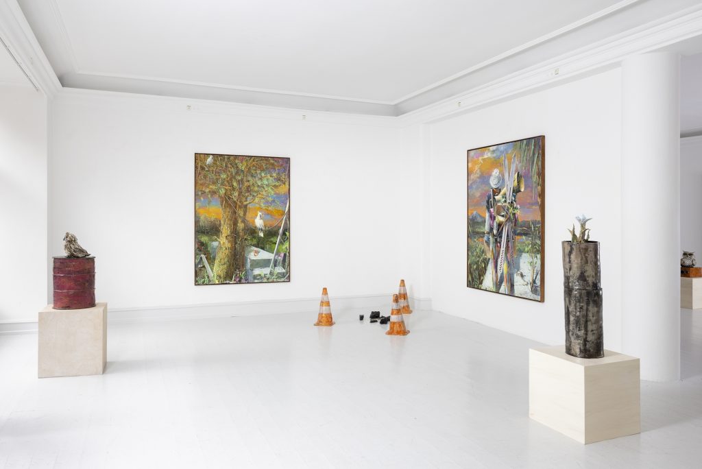 In relation to the modelling of ceramic sculpture there is a continuum of interrelated works between his paintings and sculptures. But there appears a specific importance given to humour and the comic which, though evident in his paintings, is more pronounced in the artist’s working within the three dimensions of sculpture. In the sculpture BRIAN (2024) a mouse sits on top of a ceramic (cast) oil drum while smoking a cigarette, in another example, CASSANDRA (MAGENTA BARREL) (2024), a small Minerva owl looks querulously towards the viewer.13 As a result two material questions emerge, the first as to the artist’s investigative interest in the collocation of the natural and the synthetic source material as subject matter, the organic and the artificial, and equally his use of non-relational scale as seen in the sculptures. It is a feature of Bornstück’s sculpture, and also his paintings that he frequently plays with an elasticity of figures’ and objects’ scale and juxtaposition. In the sculptures HÜTCHEN (2024), a simple utilitarian plastic traffic cone has been modelled and cast into a glazed ceramic edition, a commonplace and ubiquitous object of the every- day you might kick over in the street has been trans- posed and given the elevated artistic status of sculpture. This said, for the most part the sculptures are closely related to any number of paintings, the same cigarette smoking mouse appears in a small painting sitting atop an old amplifier in BATTERY RAVE (2024), or in another example two mice are sitting in front of a fire warming themselves in LA ISLA BONITA (The Beautiful Island, 2024), a witty side reference no doubt to Madonna’s famous song of the mid-1980s.14 The small ceramic PLANTASIA (STEINBRECH BLAU) (Plantasia (Blue Saxifrage), 2024) sculp- ture series is obviously visually relatable to paintings like ALBINO ENZIAN where the fragile flower asserts itself against the synthetic concrete surface. It continues as a resonant theme in Fritz Bornstück’s sense of painterly endeavour, the mediated reassertion of nature and the natural world, a pictorial vision hidden under the mask or guise of imagined landscapes and staged sometimes theatrical-fanciful settings. The objects and ‘things’ of the world are the material accumulations we carry and randomly discard, since the wanderer lives with an uncertain outcome, as the poet affirms, “In the middle of the journey of our life I came to myself within a dark wood, where the straight way was lost.”