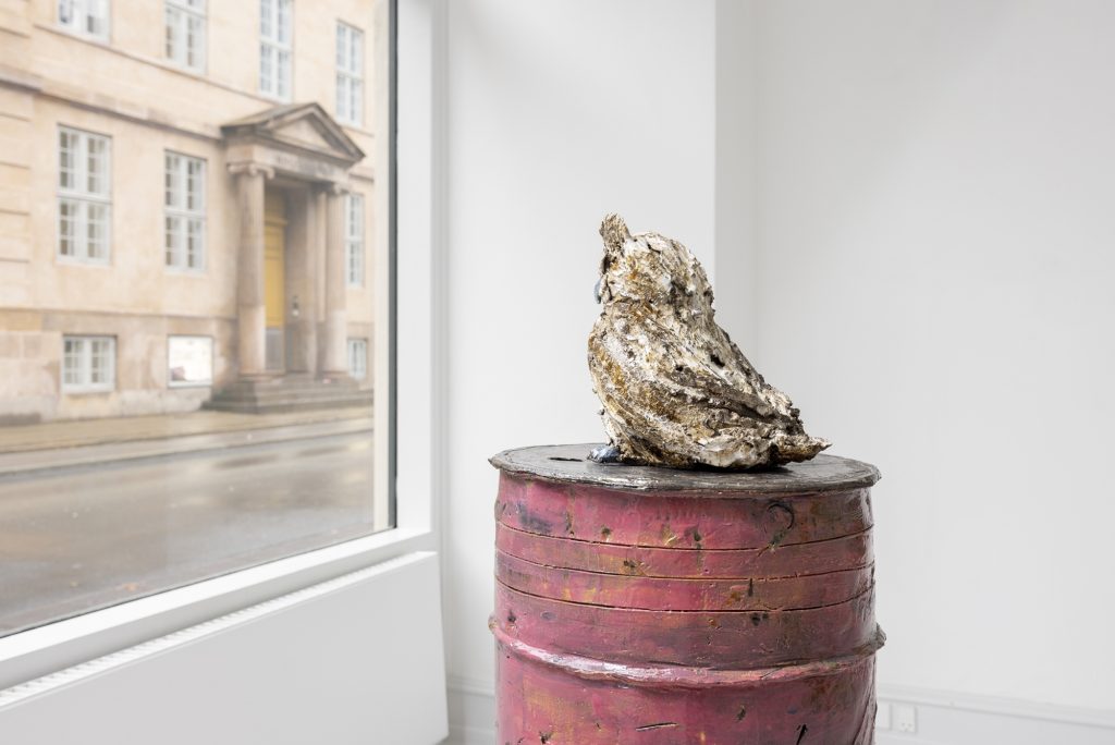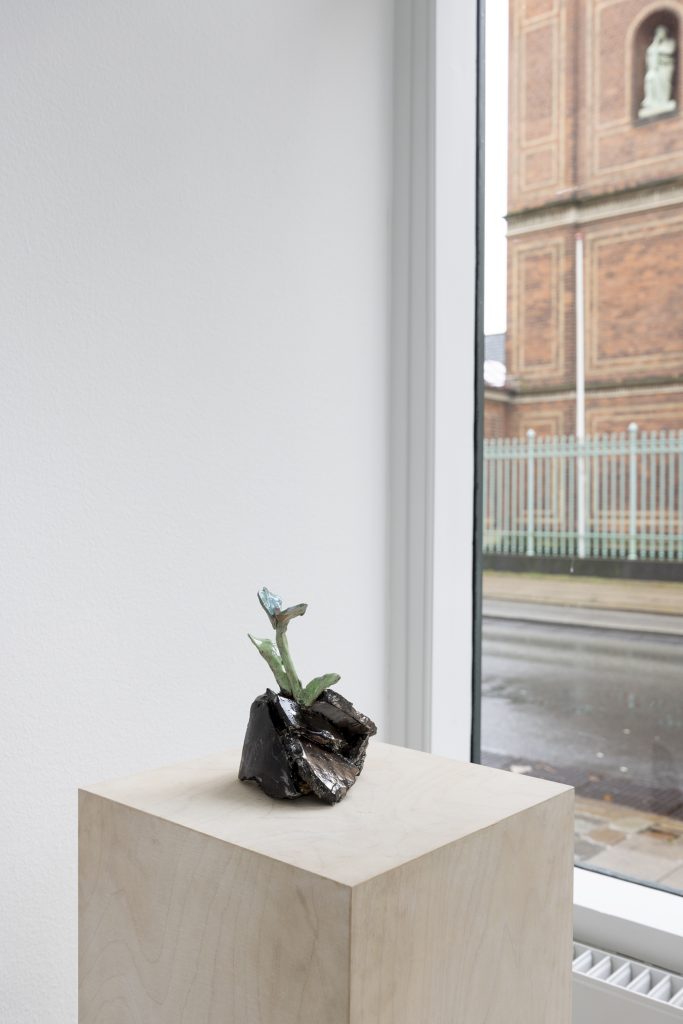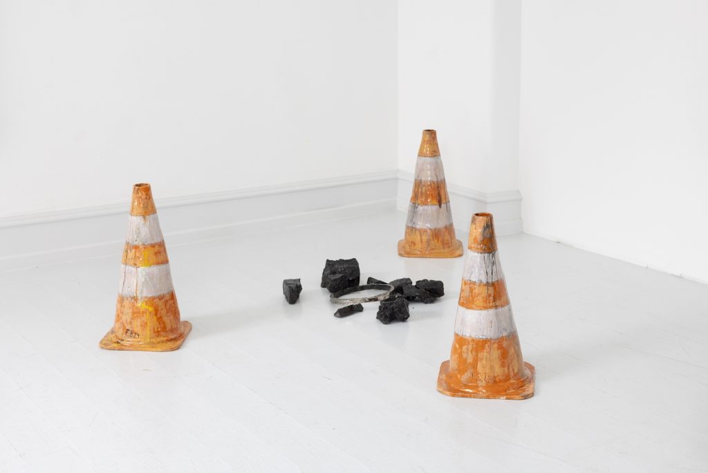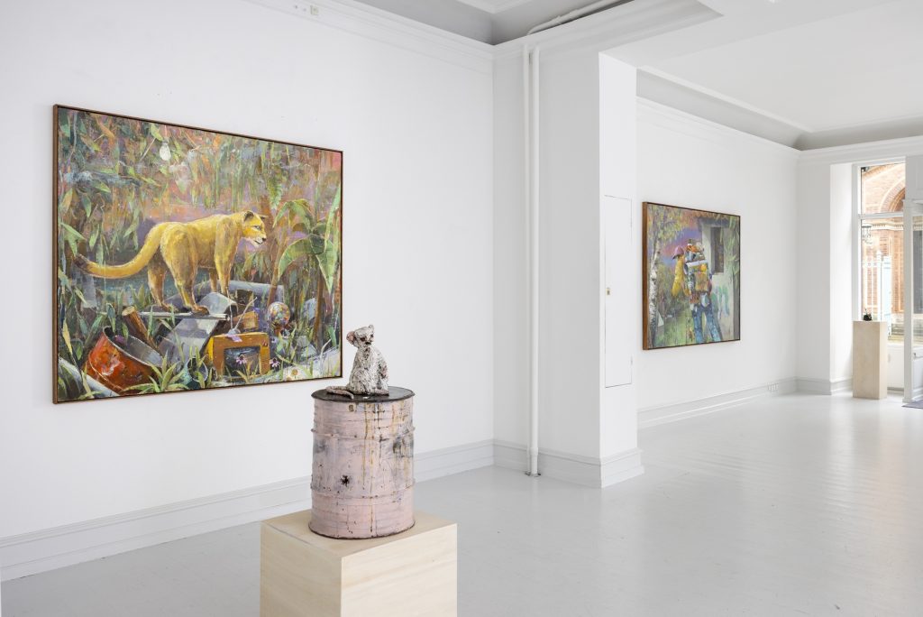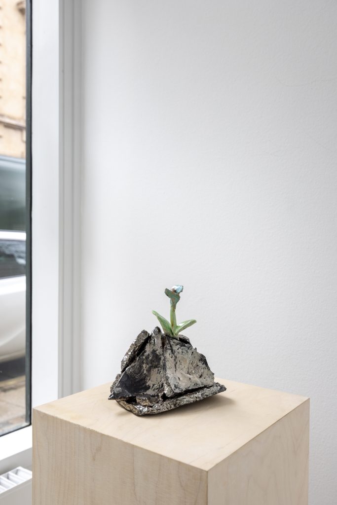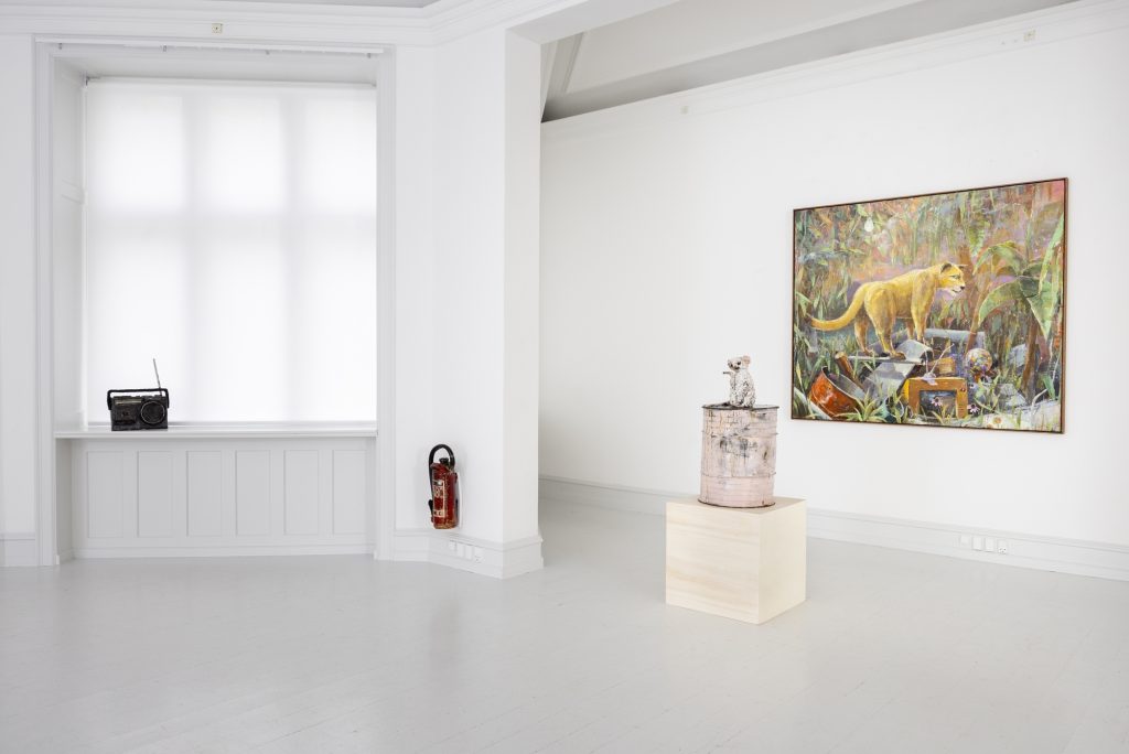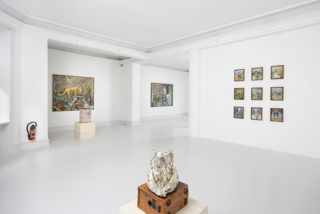 In relation to the modelling of ceramic sculpture there is a continuum of interrelated works between his paintings and sculptures. But there appears a specific importance given to humour and the comic which, though evident in his paintings, is more pronounced in the artist’s working within the three dimensions of sculpture. In the sculpture BRIAN (2024) a mouse sits on top of a ceramic (cast) oil drum while smoking a cigarette, in another example, CASSANDRA (MAGENTA BARREL) (2024), a small Minerva owl looks querulously towards the viewer.13 As a result two material questions emerge, the first as to the artist’s investigative interest in the collocation of the natural and the synthetic source material as subject matter, the organic and the artificial, and equally his use of non-relational scale as seen in the sculptures. It is a feature of Bornstück’s sculpture, and also his paintings that he frequently plays with an elasticity of figures’ and objects’ scale and juxtaposition. In the sculptures HÜTCHEN (2024), a simple utilitarian plastic traffic cone has been modelled and cast into a glazed ceramic edition, a commonplace and ubiquitous object of the every- day you might kick over in the street has been trans- posed and given the elevated artistic status of sculpture. This said, for the most part the sculptures are closely related to any number of paintings, the same cigarette smoking mouse appears in a small painting sitting atop an old amplifier in BATTERY RAVE (2024), or in another example two mice are sitting in front of a fire warming themselves in LA ISLA BONITA (The Beautiful Island, 2024), a witty side reference no doubt to Madonna’s famous song of the mid-1980s.14 The small ceramic PLANTASIA (STEINBRECH BLAU) (Plantasia (Blue Saxifrage), 2024) sculp- ture series is obviously visually relatable to paintings like ALBINO ENZIAN where the fragile flower asserts itself against the synthetic concrete surface. It continues as a resonant theme in Fritz Bornstück’s sense of painterly endeavour, the mediated reassertion of nature and the natural world, a pictorial vision hidden under the mask or guise of imagined landscapes and staged sometimes theatrical-fanciful settings. The objects and ‘things’ of the world are the material accumulations we carry and randomly discard, since the wanderer lives with an uncertain outcome, as the poet affirms, “In the middle of the journey of our life I came to myself within a dark wood, where the straight way was lost.”