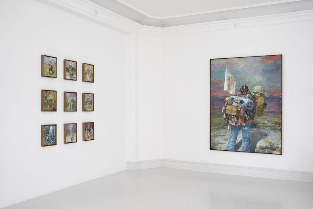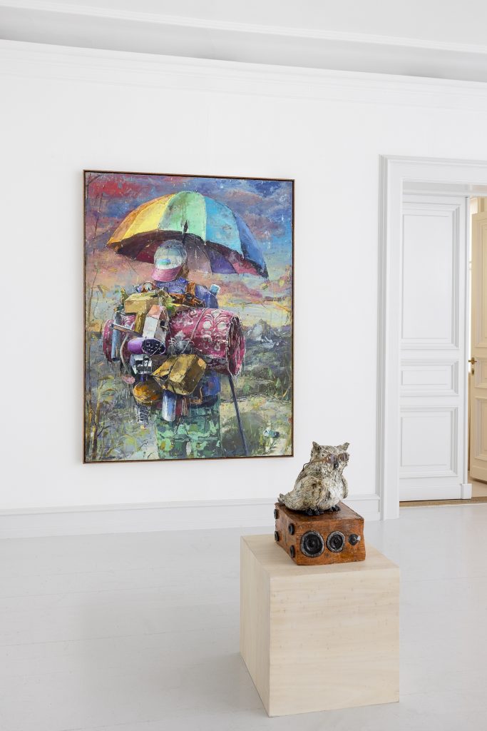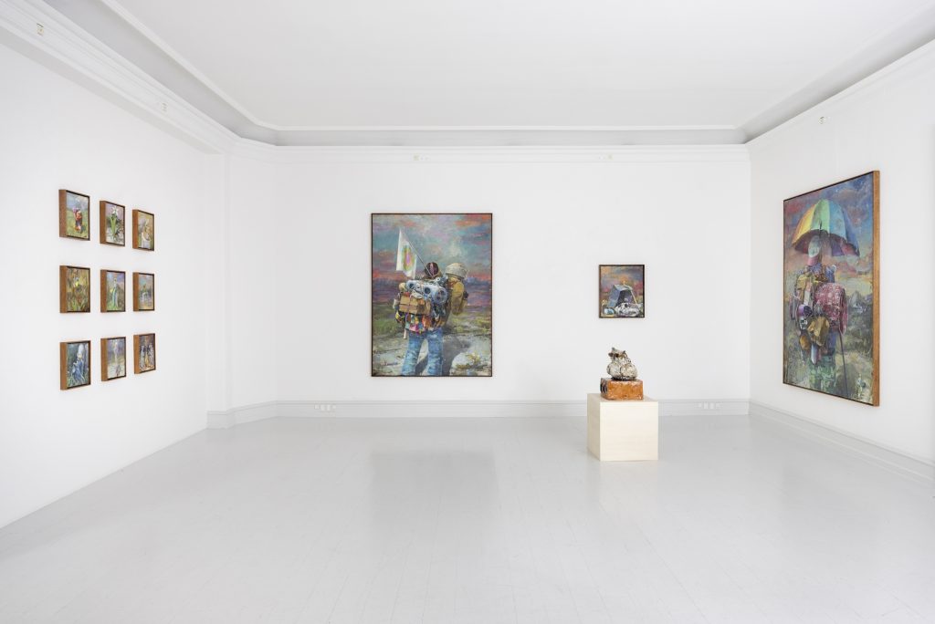 In the mid-size painting ON AND ON (2024) we see centrally placed the figure of the traveller, voyager or wanderer, presented with their back to the viewer as an anonymous everyman, or woman, since gender is not defined. They are metaphors for the existing process in which they are preoccupied, namely that of the journey. Carried on the back of the journeying figure is the visual world of incongruous objects, part of the familiar and extended vocabulary of material associations found in many of Bornstück’s paintings, the bowl of gobstoppers, cylinders, cardboard boxes and the like. They represent an accumulated memorial of associations that are collated and re-circulated within the discontinuous creative consciousness of the artist.8 The setting is an imagined repoussoir landscape, with the silver birch to the left and a cabanon (shed) building to the right. The composition acknowledges that if the central figure were removed the viewer is conveyed directly into the space beyond. In pictorial terms this further adds to the visual sense of travel projection, just as the pink pearlescent sky at the horizon hints at the chosen diurnal moment of transient departure. Yet it remains for all that an imagined and collated landscape, and as often in the case of Bornstück, the liana-like foliage to the right adds a speculative sense of botanical exoticism. If we look at ON AND ON alongside FOLLOWING (2024), which has two persons, we might imagine the convention of a shared passage, but yet again the figures are seen from the rear and no suggestion is made of their having entered a shared journey or enterprise. The idea of journeying or passage and encounter as we might see in Courbet’s famous painting The Meeting (1853), where figures meet along the road, is not evident, for no inferred contact or social observation is made by the artist. Again the fore- ground figure right is overladen with flea-market unrelated objects, skis, books, a bed roll, doll’s house, bottles, a crushed ring-pull drinks can, as well as the artist’s ubiquitous love of cardboard boxes. They travel into a rocky and relatively spartan valley with Mount Artesonraju at the horizon, an image known to most for its appropriation as logo of the Paramount film corporation. We see another wandering figure overladen with material accoutrements in A VALLEY BELOW (2024), yet the indicative setting is somewhat different. In this instance the deciduous trees are verdant and the nature setting is temperate, a dog appears in the lower centre foreground.