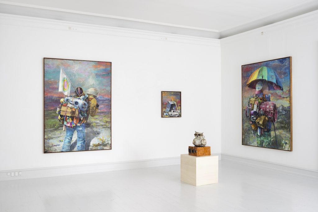 In BROKEN HOBOKEN an isolated figure is depicted under a large golf umbrella, and seen as in all instances from the back overwhelmed with calamitous objects, a bed- roll, bird’s house, an early digital clock that is without function in the journey undertaken.11 In many of his works the artist depicts and details obsolete forms of technology, reflecting the detritus and junked objects brought about by mass consumer culture and succeed- ing technologies. While the artist does not consider himself specifically a practiced draftsman, occasional drawings do exist executed in ink wash on paper; the drawing IN THE RAIN, for example, relates to BROKEN HOBO- KEN, just as ASCENDING II relates to the figurative moun- tain scene TURBULENZEN (WANDERER) (2024). But the drawn images should not be considered compositional drawings as such, and function rather as aide memoires, or at most are the outcome of an associative visual impulse.