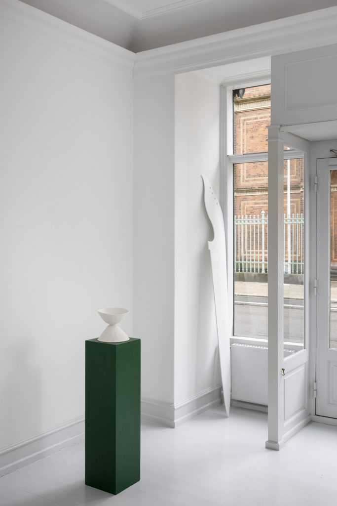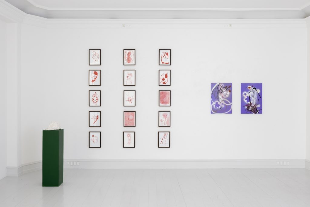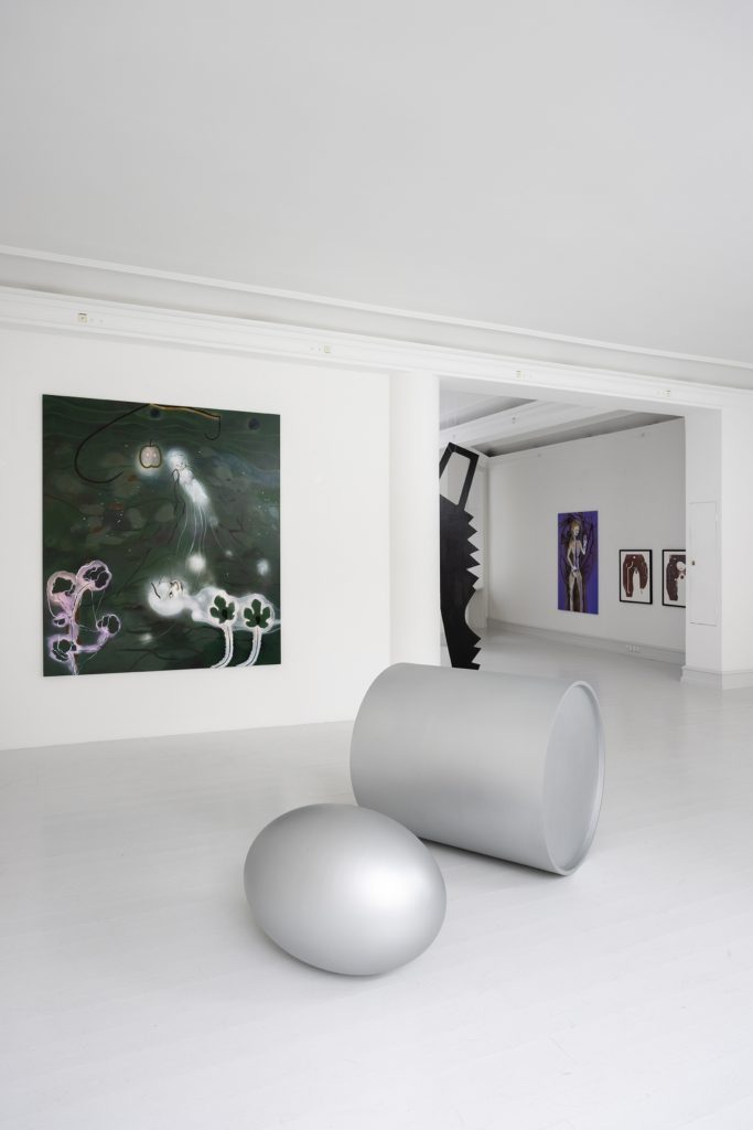 In the exhibition there is a great desire to create present spaces and stories which reach beyond the introverted and engage in a dialogue. This desire is also expressed by inviting Sophia Kalkau to participate with the sculpture Oh no not again, which is an elaboration on the theme but in a different artistic language. Kalkau’s sculpture consist of two parts placed directly on the floor. They are concrete and abstract at the same time. Concrete sizes which pull us into a poetic universe, a psychological tale in a formal language.