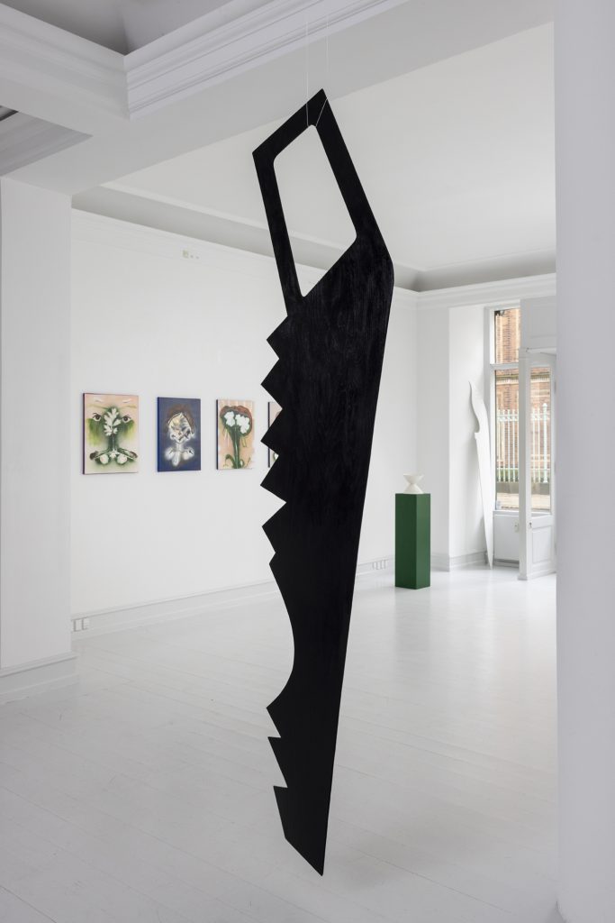 Elements from the outer world have made it into Ærtebjerg’s motives, for example leaves and knives. The elements have been processed and get their new meaning from the psychological and existential layers of the human mind, a place where the physical and psychological are one.